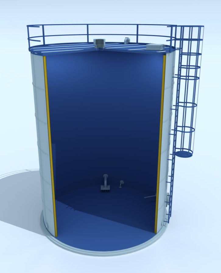 Проектирование, производство, поставка, монтаж и гидравлические испытания резервуара с термопластичным покрытием для чистой воды объемом 277 м3 – буферная емкость с рассекателем струи и активным воздухообменом над зеркалом воды для удаления фтора. Часть технологической цепочки выращивания малька, для компании АО «Инарктика» (г. Калуга)